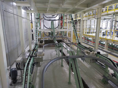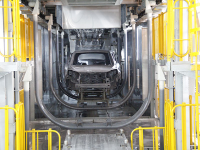 2、 浸槽垂直爬坡角度大(45°),入槽速度快,排氣好??s短了前處理和電泳設(shè)備的長度。降低了前處理設(shè)備成本。