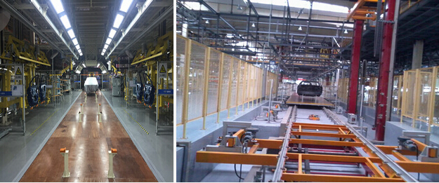 滑板式輸送機(jī)由滑板、摩擦驅(qū)動(dòng)組成。主驅(qū)動(dòng)利用摩擦驅(qū)動(dòng)輪驅(qū)動(dòng)滑板兩側(cè),該滑板靠此推力又將前面的滑板向前推送,這樣就形成連續(xù)輸送?;遢斔蜋C(jī)同時(shí)移動(dòng)車身和進(jìn)行裝配的操作工人,使工人在裝配工序的操作更加容易。