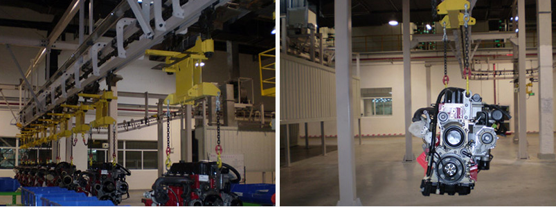 該項目是北汽福田康明斯投資的一個發(fā)動機廠,主要生產(chǎn)柴油發(fā)動機。積放式懸掛輸送系統(tǒng)用于工件的連續(xù)輸送和儲存。該系統(tǒng)分為兩個部分,NO1負責(zé)把兩種柴油機總成輸送到熱試線,系統(tǒng)采用兩臺變頻電機減速機驅(qū)動,實現(xiàn)兩種發(fā)動機混流上下線,空中可實現(xiàn)積放20分鐘。在總裝線下料處有兩臺帶式升降機,一臺用于2.8L發(fā)動機上料,另一臺用于3.8L發(fā)動機上料。熱試線下料處有兩臺帶式升降機,兩種發(fā)動機可通用。NO2將兩種柴油機總成從熱試線經(jīng)涂裝線輸送到附件裝配。系統(tǒng)共有六條輸送鏈,采用地面立柱和空中吊掛形式。分別完成輸送、工位操作、存儲、工位操作、烘干后冷卻和輸送等功能。系統(tǒng)設(shè)四臺帶式升降機,用于發(fā)動機的上線和下線。積放式懸掛輸送機控制系統(tǒng)通過工業(yè)以太網(wǎng)形式接受工藝信息,并將系統(tǒng)運行狀態(tài)和故障信息通過以太網(wǎng)發(fā)送的上位機系統(tǒng),系統(tǒng)自動讀取兩種發(fā)動機的區(qū)分信息和標志,實現(xiàn)自動區(qū)分工件的功能。系統(tǒng)預(yù)留RIFD的PROFIBBUS接口,方便以后RIFD系統(tǒng)的擴展。