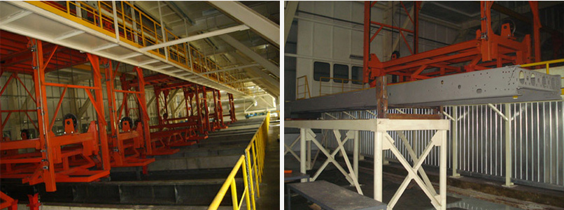 輸送系統(tǒng)主要用于車架的上件、前處理、電泳、烘干、強(qiáng)冷及下件等工件。工件通過電動(dòng)單梁起重機(jī)放到支架上,程控行車運(yùn)行到工件的上方,人工將工件掛在掛具上,進(jìn)行前處理、電泳,處理完后程控行車將工件放在轉(zhuǎn)運(yùn)車上,輸送到同步雙鏈輸送機(jī)的上件端,將工件轉(zhuǎn)掛到雙鏈輸送機(jī)的掛鉤上,進(jìn)行烘干和強(qiáng)冷。系統(tǒng)共設(shè)有7臺(tái)程控行車,依次完成工件的脫脂、清洗、表調(diào)、磷化、陰極電泳、UF液清洗等工藝。系統(tǒng)采用公司研發(fā)的程控行車,生產(chǎn)綱領(lǐng):40000臺(tái)車架/年;生產(chǎn)節(jié)拍:6min;工件外形尺寸:11565×1080×800mm;每掛的質(zhì)量:2800kg。